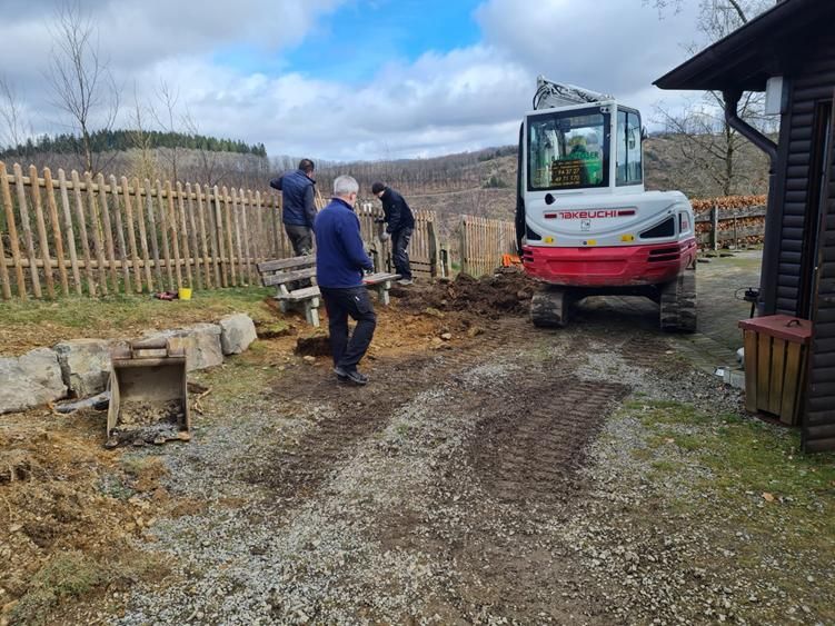 Der Grillplatz wurde aufgeschüttet, begradigt und gepflastert. Zur Hütte hin, wurde eine Edelstahlrinne angebracht.
