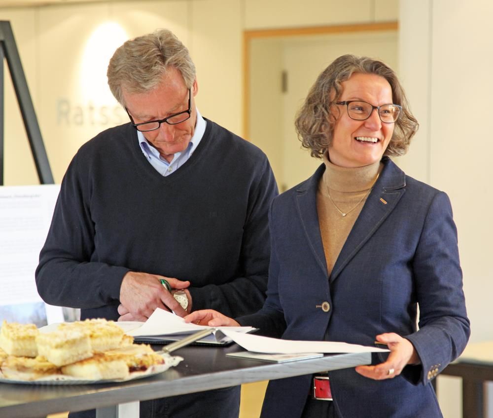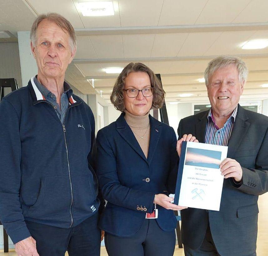 Als kleine Präsente und Andenken erhielt Ministerin Ina Scharrenbach ein selbst verfasstes Buch über die Olper Bergbau-Geschichte von Peter Maiworm sowie einen in Glas gelaserten Miniatur-Pannenklöpper von Bürgermeister Peter Weber.